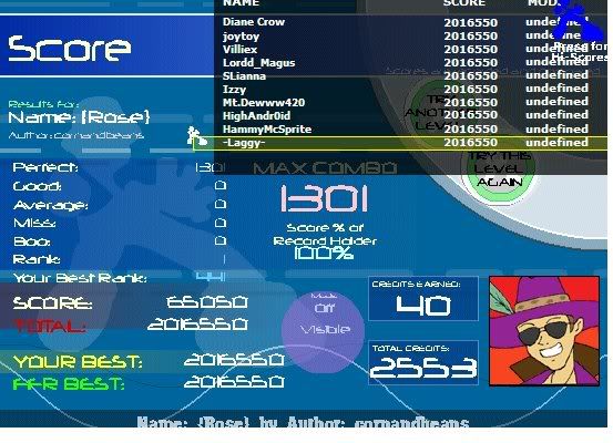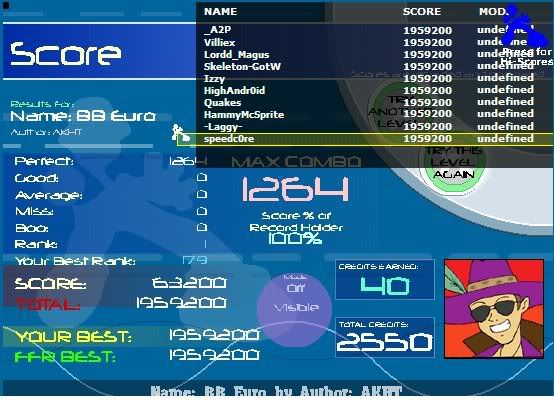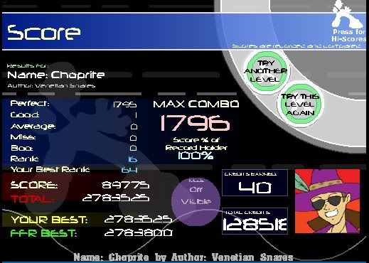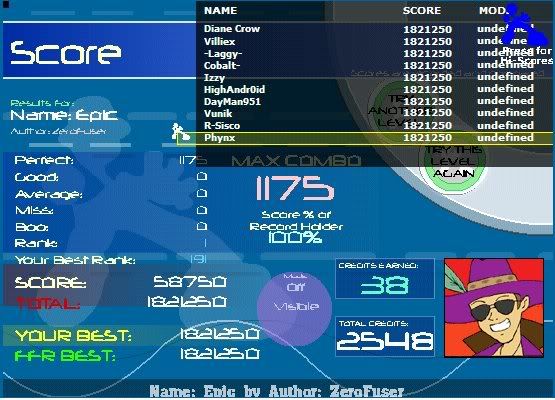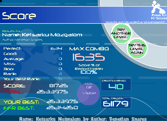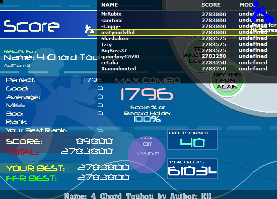#339: Blue Army 3,330 - 0 - 0 - 0 - 0 Yay, 1st try today 2nd try ever #338: Nova Pulser 762 - 0 - 0 - 0 - 0 Fixed, 1st try today #337: X-Tinction 744 - 0 - 0 - 0 - 0 Wow this took me a zillion tries. I SUCK at 32nd rolls that can't be jumpmashed. #336: Club 573 - 0 - 0 - 0 - 0 I told you all it was easy! #335: Novo Mundo 1,264 - 0 - 0 - 0 - 0 This is not an 11 in any way #334: Xeno-Flow 1,831 - 0 - 0 - 0 - 0 Fixed, 1st try today Reality 919 - 2 - 0 - 0 - 0 Pretty satisfied with this, AAA later. 4 Chord Touhou 1,795 - 1 - 0 - 0 - 0 So random of a good. AAA later Eradication 1,339 - 3 - 0 - 0 - 1 This file is a complete dump IMO =/ Piano Etude (Gymnastics) 1,245 - 6 - 1 - 1 - 5 I STILL HAVEN'T MANAGED TO FC LULZ Revolutionary Etude 1,501 - 75 - 13 - 11 - 90 I'm awful at this now Caprice 1,299 - 1 - 0 - 0 - 0 Dumb good, AAA later, very simple file now, pseudosightread Electro Rush x8 v2 1,212 - 3 - 0 - 0 - 1 AWESOME run. Rank 3, and an 8 TP req. AAA'd final stream, all goods were in bursts. Easily my best score this summer so far. Reached T1 today with 571 TP's! Still only 339 AAA's too, so it's only going to improve.