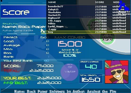 Ohmahgod. ![]() Edit: Yeah, Laggy and Shash, those scores are awesome. I've seen the replay of that song, and it isn't pretty. 0.o Last edited by Jtehanonymous; 08-5-2008 at 11:56 AM.. |