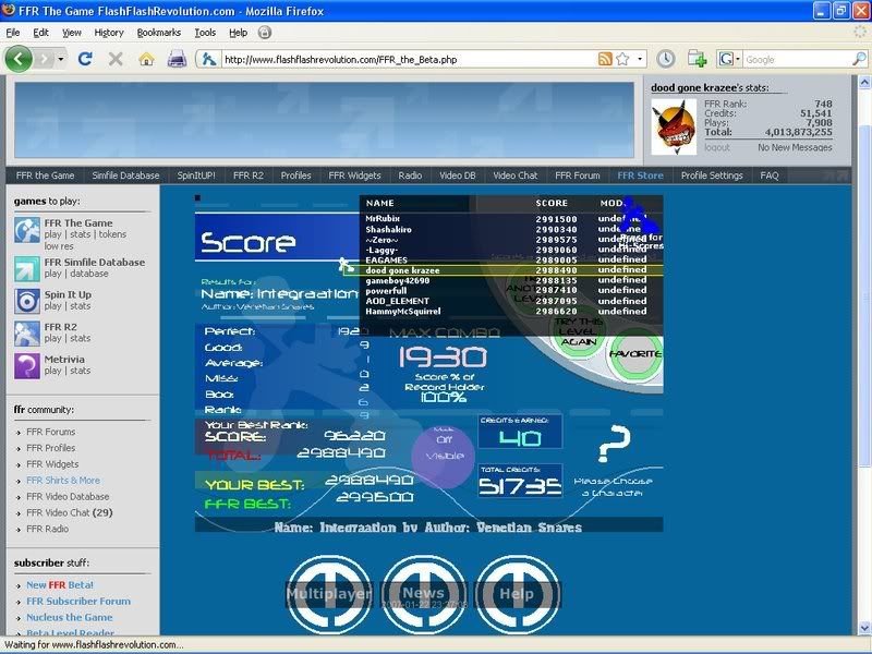 This is ridiculous. Besides, watching Kirby's scores I really don't think he'll be getting anywhere soon. He hasn't seemed to FC it yet. I'd be quite happy with 3rd place. I was actually aiming for vROFL, but I got farther. So 3rd gives me $20 and a 6 month subbie. I also really wanted a T-shirt, and $20 covers that. I think I'll be happy with that at least. There's always next year to get farther. I just hope I'm not cranked up into Masters next time. Ughhhh.