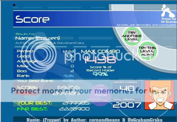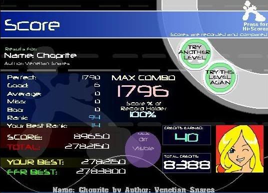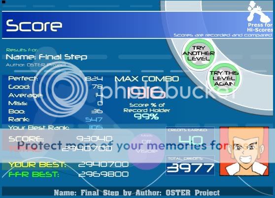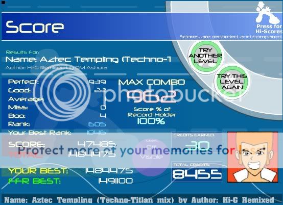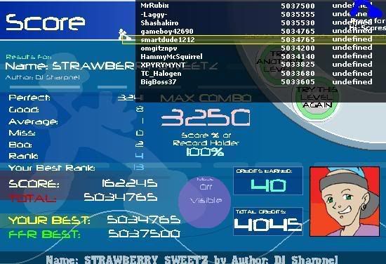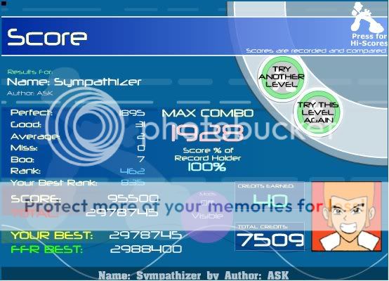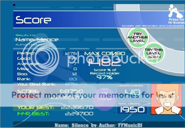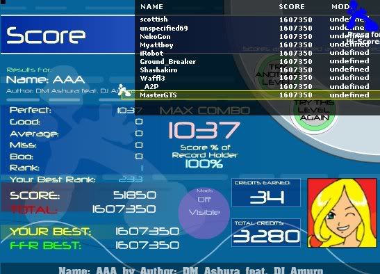![]() I hate this song. Finally got this. Rebirth you're killing me... ![]() A song that i had to reAAA TWICE. Oh wait, another rebirth simfile...LOL Here's old Video when I first AAAed it. Video: http://www.youtube.com/watch?v=YJ_qFG7P1hY ![]() OMFG YES!!! First try today!!! Wo0t ![]() EDIT: This was a good AAA for me. ![]()