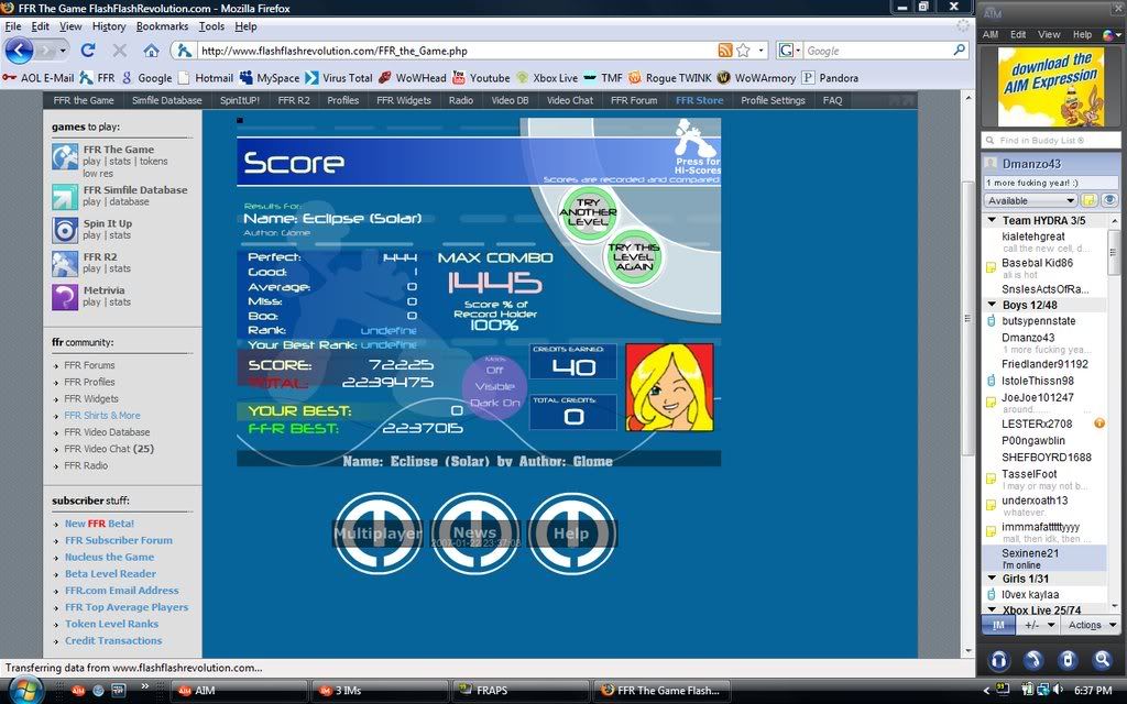 1st in Kommisar's 2009 SM Tournament 1st in I Love You`s 2009 New Year`s Tournament 3rd in EnR's Mashfest '08 tournament 5th in Phynx's Unofficial FFR Tournament 9th in D3 of the 2008-2009 4th Official FFR Tournament 10th in D5 of the 2010 5th Official FFR Tournament 10th in D6 of the 2011-2012 6th Official FFR Tournament FMO AAA Count: 71 FGO AAA Count: 10 Bluearrowll = The Canadian player who can not detect awkward patterns. If it's awkward for most people, it's normal for Terry. If the file is difficult but super straight forward, he has issues. If he's AAAing a FGO but then heard that his favorite Hockey team was losing by a point, Hockey > FFR PS: Cool AAA's Terry - I Love You An Alarm Clock's Haiku beep beep beep beep beep beep beep beep beep beep beep beep beep beep beep beep beep - ieatyourlvllol |