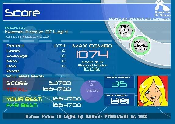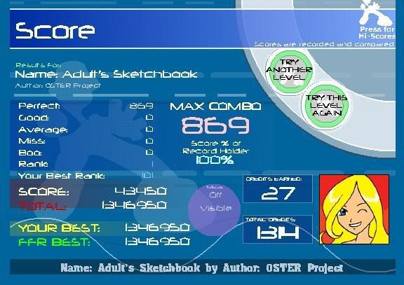 ![]() Those are really good scores from both of you as well, geez. 0.0' I was trying to get Sepia...but I realized that it's the most evil song in the world. Then I tried for this: ![]() |