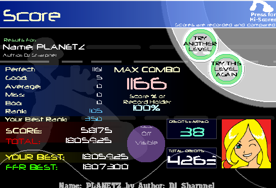 ![]() Boo flag epi...ouch :< Go for all synth files travman x.x Edit: Ughh, the 70 or less tier req is impossible to get. Still a cool score for mashing that entire long 32nd run. (7)- 70 or fewer (2,220,500) +2,645 (6)- 150 or fewer (2,198,500) (2,217,755) ![]() Last edited by [TeRa]; 10-14-2008 at 07:28 AM.. |