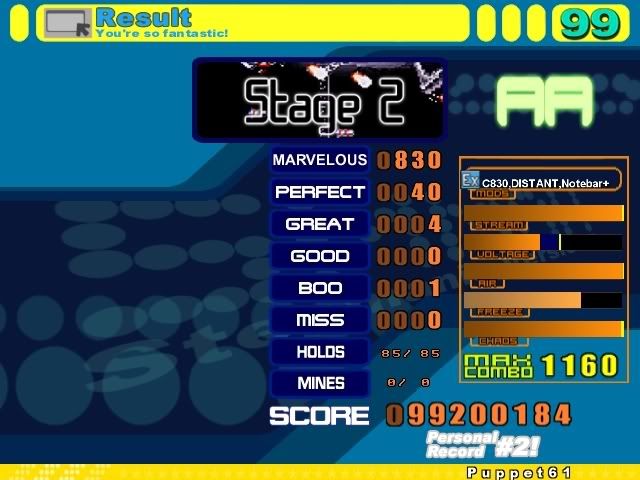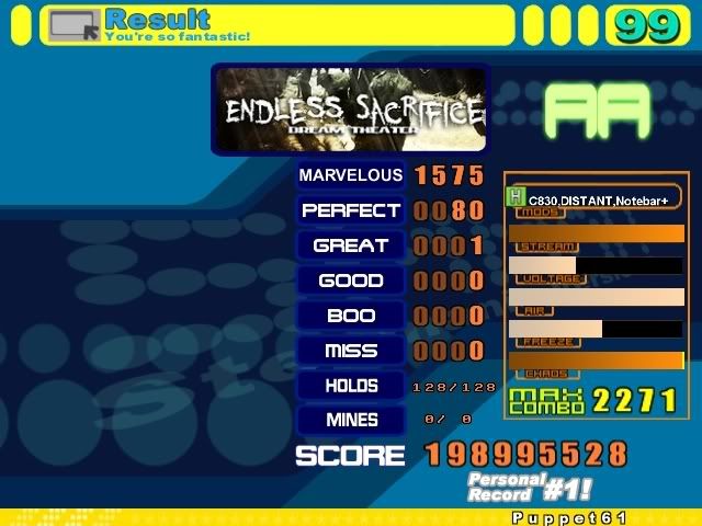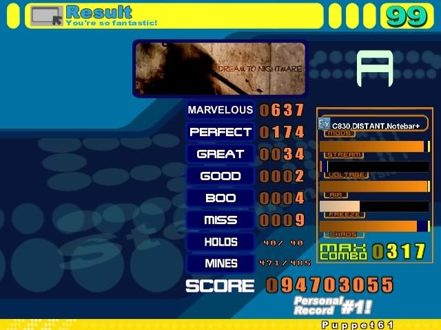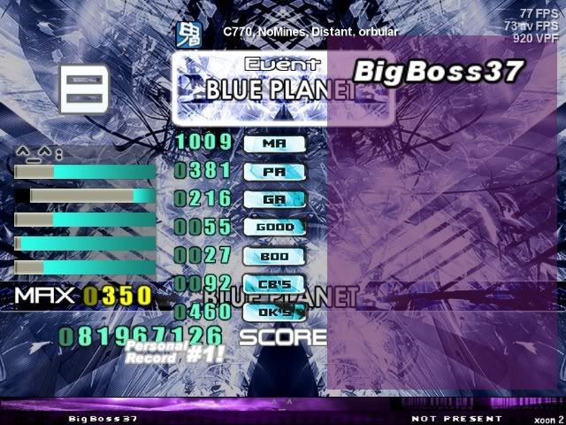 bleh ma, almost aaa'd though. this file's a dump ![]() p. nice ma, bad pa ![]() kb misses in some [34] jack, woulda been nice ![]() eh ![]() might try to sdp this or somethin crazy eventually ![]() could aa on a fluke run but damn i hit so many mines in the ending bursts ![]()