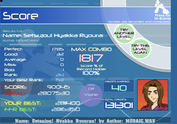 ![]() 1st place in Expert Division of Phynx's 2nd Unofficial FFR Tournament ![]() Tier Points: 605 (565 + 40 for 671 AAAs) Last edited by Zap_Track; 11-12-2008 at 03:54 PM.. |