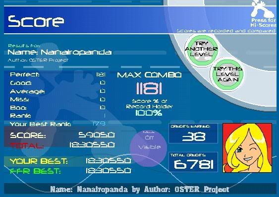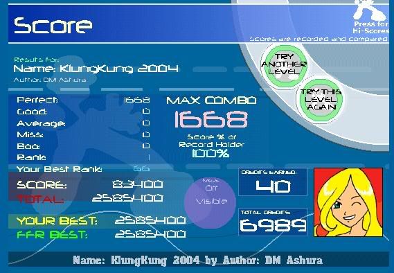![]() I got this Falsie thingy, lol. ![]() This wasn't the easiest Challenging song to AAA. xD ![]() Still got it, even though it felt like I screwed up a few rhythms. I held my breath at the coloured note part right at the end. Phewww. =X ![]() A few tricky parts in this one ![]() ![]() ![]() Last edited by Jtehanonymous; 11-29-2008 at 09:26 PM.. |