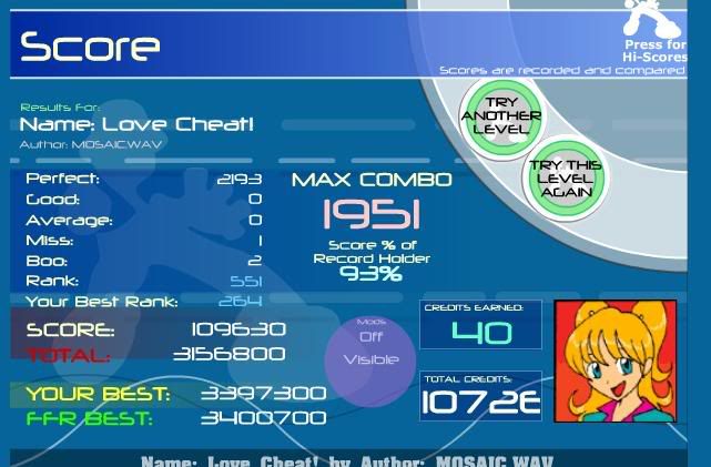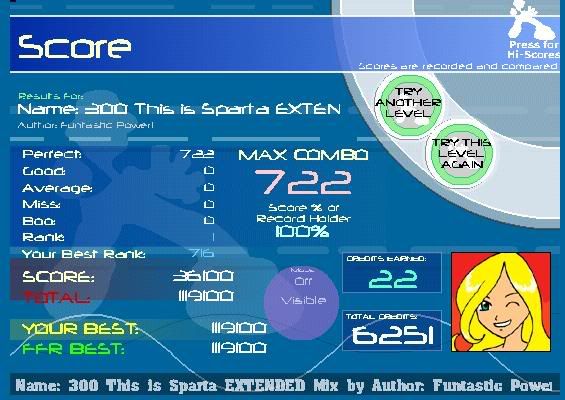 ****! ;_; Got a boo before the slow down, and somewhere before the song picked up again, then I missed. Takes me a bit to get adjusted to FFR timing from SM, since FFR has only perfs to get for AAA, but SM has marvs and perfs....and I can't do well with just having pressure to hit one. So i probably won't do good on that song for awhile again x.x