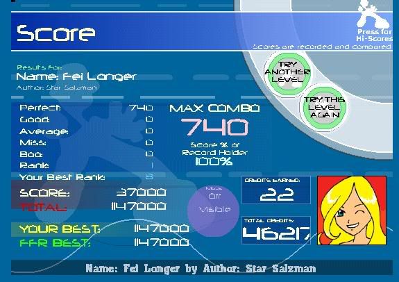 This is my first post in the BB, and boy do I feel dumb right about now. This score earned me UNknown Girl, but I hit late and missed on half of the first jump in the file.