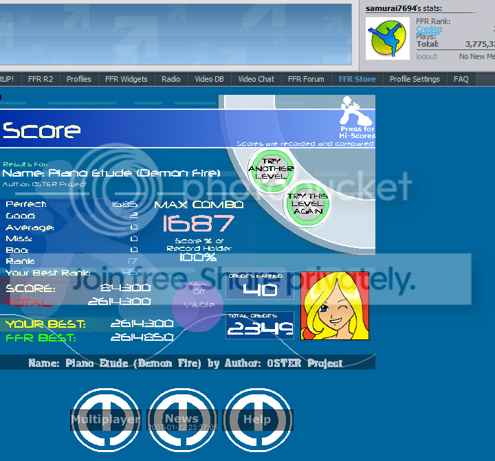 ![]() @Redorigami: Night and Day gets a lot easier the more you play it through. You should SDG it in no time. This song is really cool. ![]() 2nd FMO AAA. ![]() Last edited by Jtehanonymous; 01-10-2009 at 01:52 AM.. |