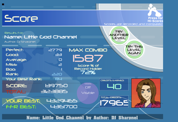Removed a .gif image so your total signature size isn't well over 1MB. Keep this in mind for the future. 5th Official FFR Tournament Scores (Division 5) Round 1: Novo Mundo (AAA) Round 2: 4 Chord Touhou (AAA) Round 3: October (1.0.0.1) Round 4: Silly Symphony (1.0.0.0) Round 5: Hardkore Atomic (4.0.0.1) Round 6: Blue Rose (2.0.0.0) Round 7: La Dump (Eliminated for being lazy.) ![]() Quote: