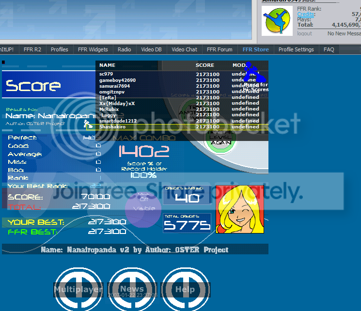![]() Boos because I can't do the beginning trill at all. ![]() A big rank improvement for me. I still can't read the purple part in the middle. XD. ![]() This was pretty sad. ![]() Last edited by Jtehanonymous; 01-30-2009 at 04:53 PM.. |