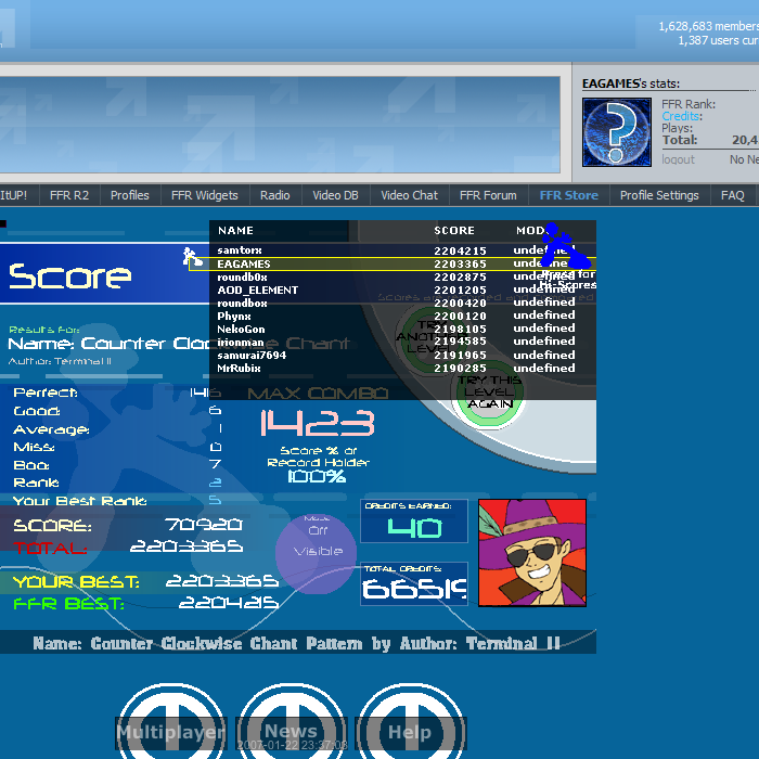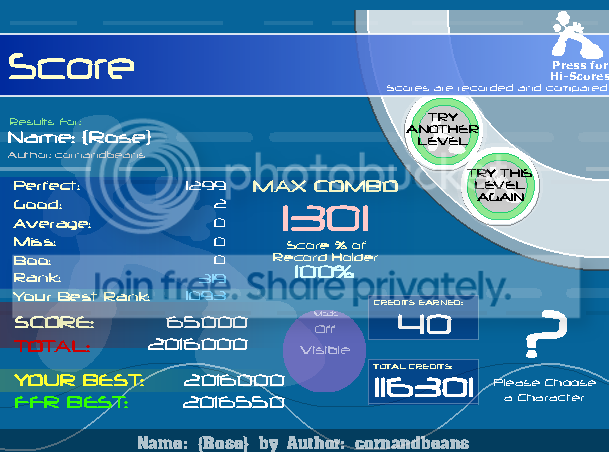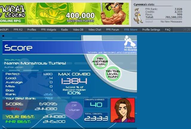 Removed a .gif image so your total signature size isn't well over 1MB. Keep this in mind for the future. 5th Official FFR Tournament Scores (Division 5) Round 1: Novo Mundo (AAA) Round 2: 4 Chord Touhou (AAA) Round 3: October (1.0.0.1) Round 4: Silly Symphony (1.0.0.0) Round 5: Hardkore Atomic (4.0.0.1) Round 6: Blue Rose (2.0.0.0) Round 7: La Dump (Eliminated for being lazy.) ![]() Quote: