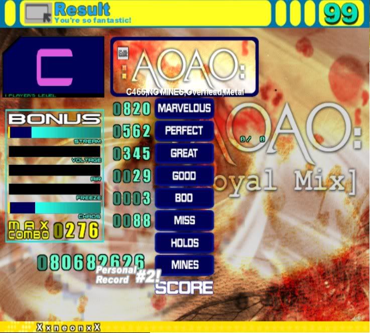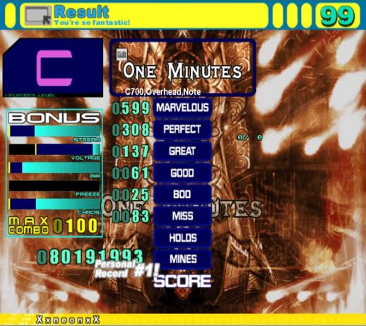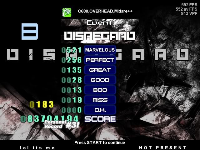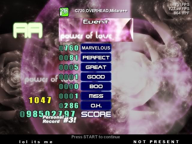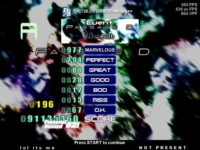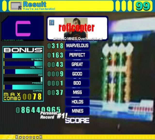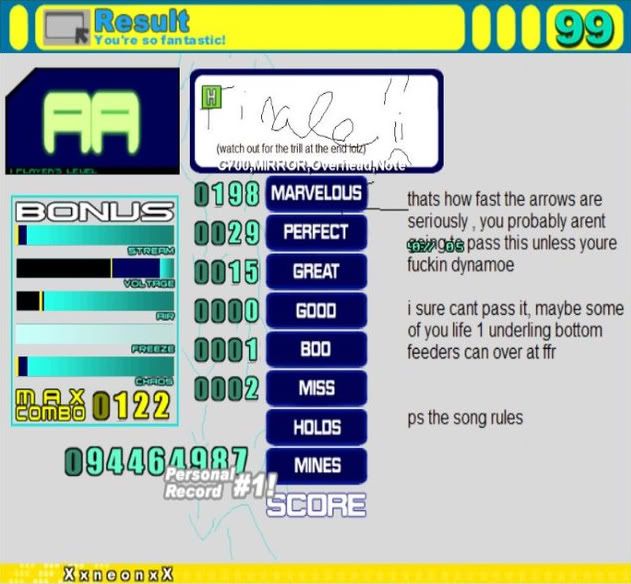 whatever ![]() alright i guess :/ ![]() ![]() terrible misses rofl but its a pass so i dont care ![]() ![]() my first pass my sec had way better misses like 71 but a worse score so ![]() whatever ![]() AOAO1.4x A vid (i dont have a screen shot) ![]() http://www.youtube.com/watch?v=1n3qid4l34c this vid is like the only cool score sorry guys ive been off my game my arms hurt so much these days i dont even really feel like playing |