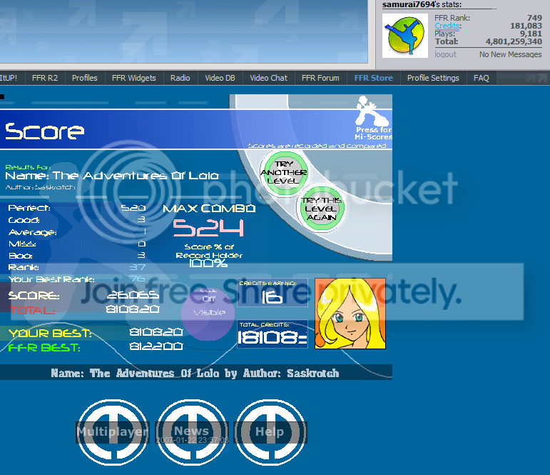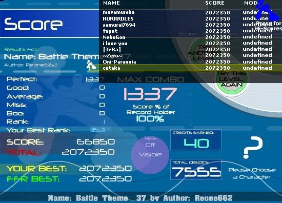 Removed a .gif image so your total signature size isn't well over 1MB. Keep this in mind for the future. 5th Official FFR Tournament Scores (Division 5) Round 1: Novo Mundo (AAA) Round 2: 4 Chord Touhou (AAA) Round 3: October (1.0.0.1) Round 4: Silly Symphony (1.0.0.0) Round 5: Hardkore Atomic (4.0.0.1) Round 6: Blue Rose (2.0.0.0) Round 7: La Dump (Eliminated for being lazy.) ![]() Quote: