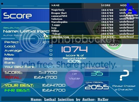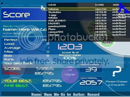 Seriously though, nice job. You're new here, so Power will be a good first AAA. Go for it. Also, don't know if you did this already and just hid the stat gauges, but if you go here: http://www.flashflashrevolution.com/levelrank.php you should get some stats on your profile, and you can see how well you've done across the public songs. |