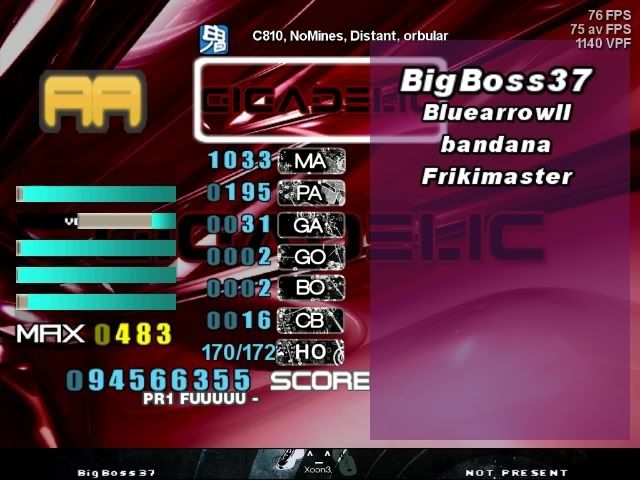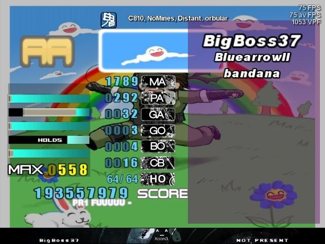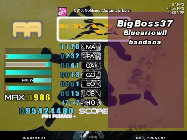 ![]() lol sightread missflag ![]() Lowered my SDG a bit ![]() To continue from Bigboss CBs I guess ![]() Personal Goal: SDCB Gets: 10 ![]() ![]() Beat Bigboss by 2 perfs lol ![]() AA'd Bigboss's OP for first time ![]() 91M ![]() First time over 86M ![]() AAA, but Pr1 is a BF withi 39 perfs lol ![]() andddddddddd a new really good score ![]() ![]()