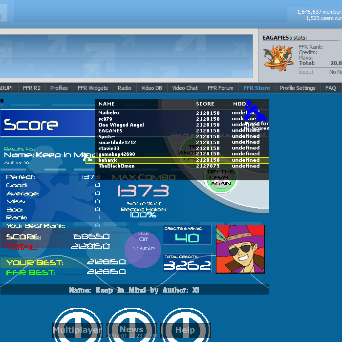 Removed a .gif image so your total signature size isn't well over 1MB. Keep this in mind for the future. 5th Official FFR Tournament Scores (Division 5) Round 1: Novo Mundo (AAA) Round 2: 4 Chord Touhou (AAA) Round 3: October (1.0.0.1) Round 4: Silly Symphony (1.0.0.0) Round 5: Hardkore Atomic (4.0.0.1) Round 6: Blue Rose (2.0.0.0) Round 7: La Dump (Eliminated for being lazy.) ![]() Quote: