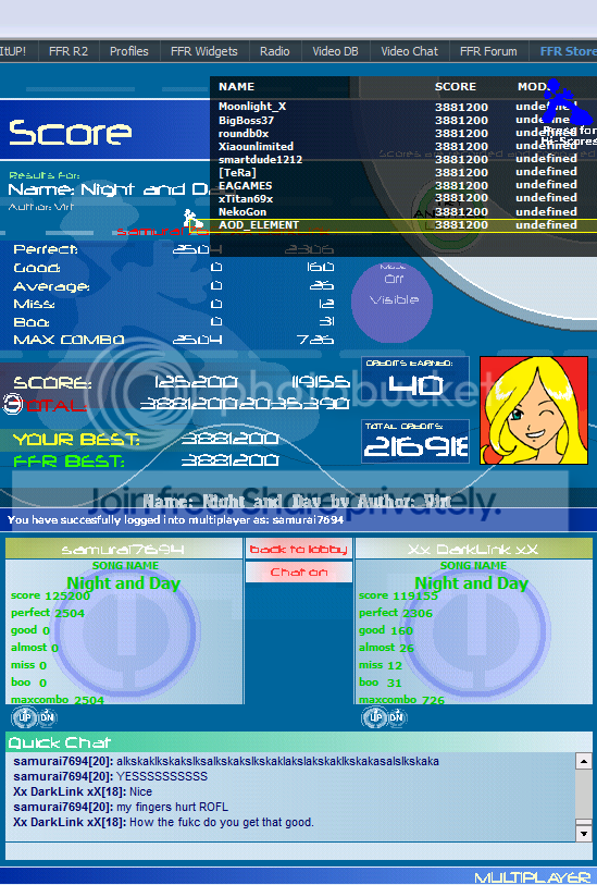 1st in Kommisar's 2009 SM Tournament 1st in I Love You`s 2009 New Year`s Tournament 3rd in EnR's Mashfest '08 tournament 5th in Phynx's Unofficial FFR Tournament 9th in D3 of the 2008-2009 4th Official FFR Tournament 10th in D5 of the 2010 5th Official FFR Tournament 10th in D6 of the 2011-2012 6th Official FFR Tournament FMO AAA Count: 71 FGO AAA Count: 10 Bluearrowll = The Canadian player who can not detect awkward patterns. If it's awkward for most people, it's normal for Terry. If the file is difficult but super straight forward, he has issues. If he's AAAing a FGO but then heard that his favorite Hockey team was losing by a point, Hockey > FFR PS: Cool AAA's Terry - I Love You An Alarm Clock's Haiku beep beep beep beep beep beep beep beep beep beep beep beep beep beep beep beep beep - ieatyourlvllol |