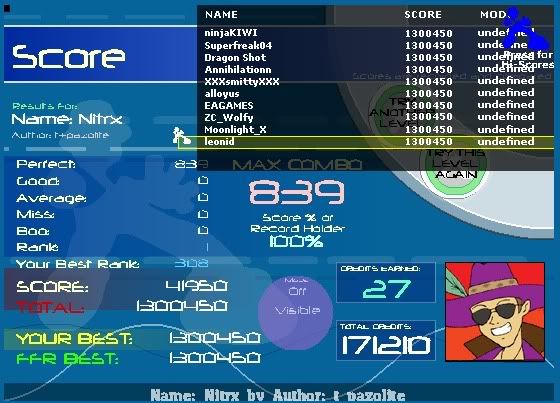 Removed a .gif image so your total signature size isn't well over 1MB. Keep this in mind for the future. 5th Official FFR Tournament Scores (Division 5) Round 1: Novo Mundo (AAA) Round 2: 4 Chord Touhou (AAA) Round 3: October (1.0.0.1) Round 4: Silly Symphony (1.0.0.0) Round 5: Hardkore Atomic (4.0.0.1) Round 6: Blue Rose (2.0.0.0) Round 7: La Dump (Eliminated for being lazy.) ![]() Quote: