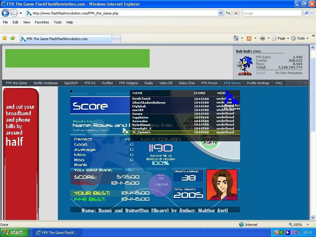 Removed a .gif image so your total signature size isn't well over 1MB. Keep this in mind for the future. 5th Official FFR Tournament Scores (Division 5) Round 1: Novo Mundo (AAA) Round 2: 4 Chord Touhou (AAA) Round 3: October (1.0.0.1) Round 4: Silly Symphony (1.0.0.0) Round 5: Hardkore Atomic (4.0.0.1) Round 6: Blue Rose (2.0.0.0) Round 7: La Dump (Eliminated for being lazy.) ![]() Quote: