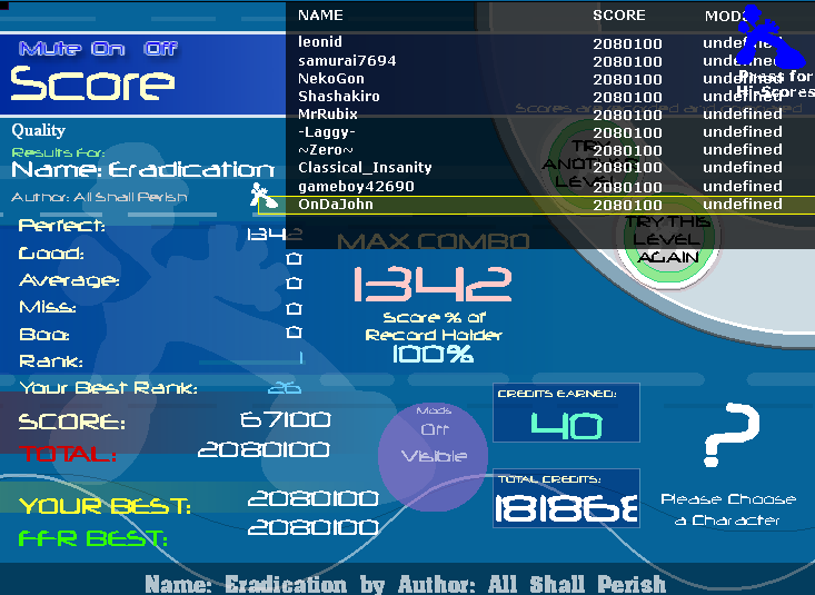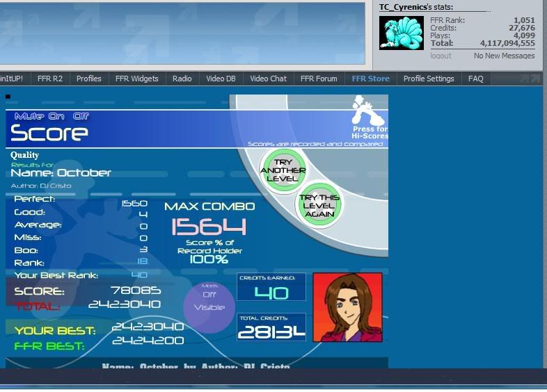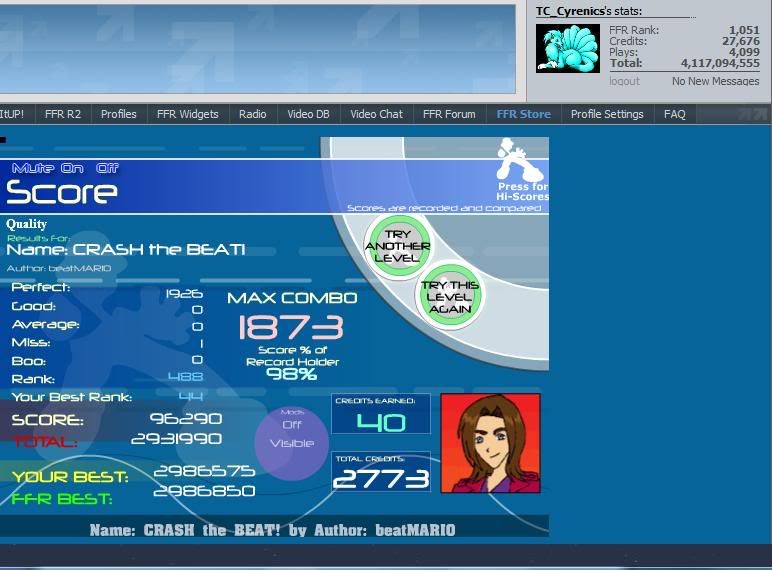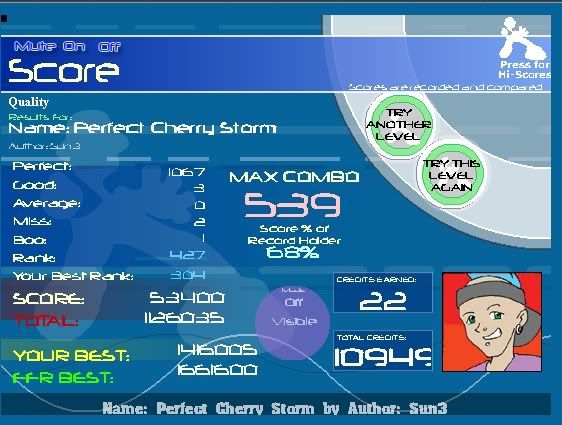 ![]() [My Profile] | [My Music] | [Play FFR] | [My Photobucket] | [My DeviantArt] AAAs: 210 (186+7+17) Best AAAs: Vertex BETA, Fighting for Control, Nova Pulser Recent AAAs: {Firestorm}, Dazzling Destiny, Hellbeat v2p 2nd place in 3rd Official Tournament 1st place in Jugglin/Jteh's 1st Tournament |