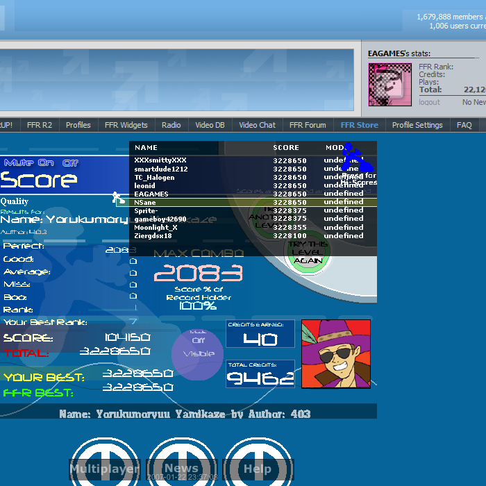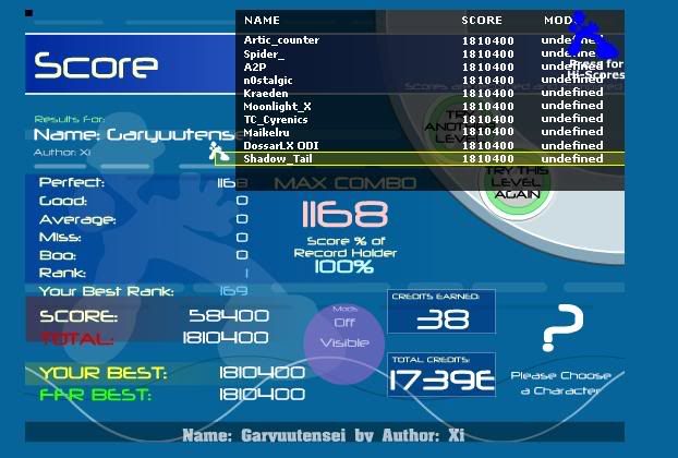 ![]() [My Profile] | [My Music] | [Play FFR] | [My Photobucket] | [My DeviantArt] AAAs: 210 (186+7+17) Best AAAs: Vertex BETA, Fighting for Control, Nova Pulser Recent AAAs: {Firestorm}, Dazzling Destiny, Hellbeat v2p 2nd place in 3rd Official Tournament 1st place in Jugglin/Jteh's 1st Tournament |