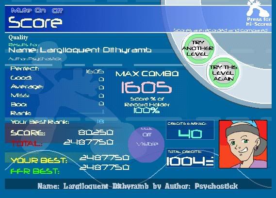 Removed a .gif image so your total signature size isn't well over 1MB. Keep this in mind for the future. 5th Official FFR Tournament Scores (Division 5) Round 1: Novo Mundo (AAA) Round 2: 4 Chord Touhou (AAA) Round 3: October (1.0.0.1) Round 4: Silly Symphony (1.0.0.0) Round 5: Hardkore Atomic (4.0.0.1) Round 6: Blue Rose (2.0.0.0) Round 7: La Dump (Eliminated for being lazy.) ![]() Quote: