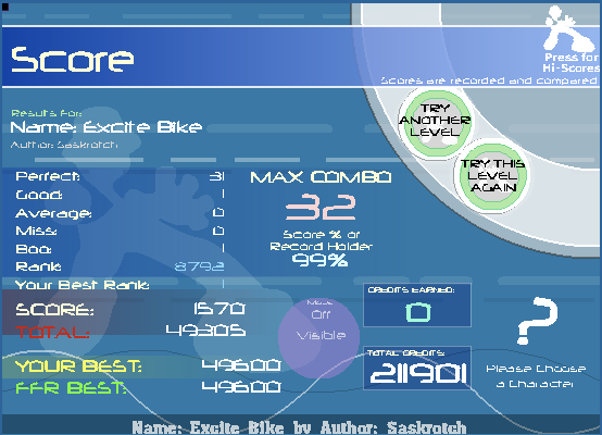 ![]() [My Profile] | [My Music] | [Play FFR] | [My Photobucket] | [My DeviantArt] AAAs: 210 (186+7+17) Best AAAs: Vertex BETA, Fighting for Control, Nova Pulser Recent AAAs: {Firestorm}, Dazzling Destiny, Hellbeat v2p 2nd place in 3rd Official Tournament 1st place in Jugglin/Jteh's 1st Tournament |