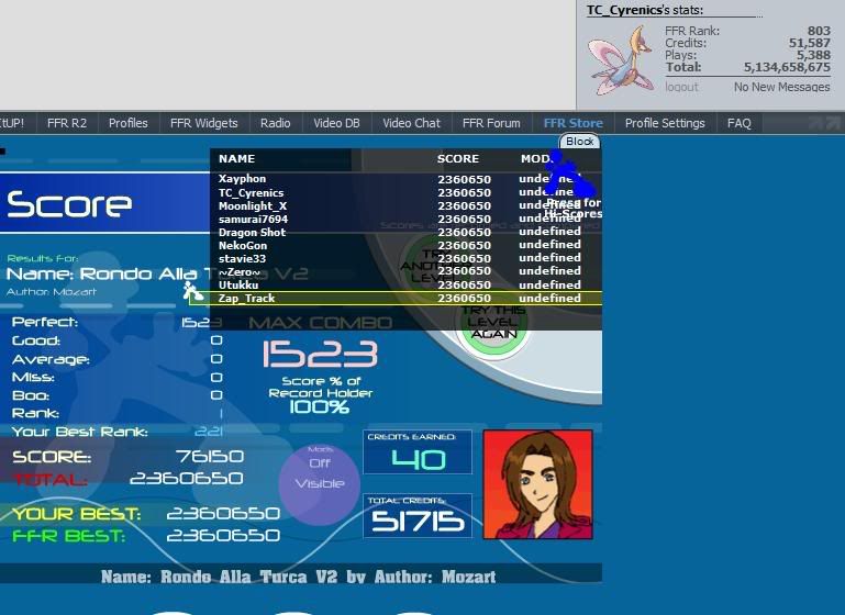 1st in Kommisar's 2009 SM Tournament 1st in I Love You`s 2009 New Year`s Tournament 3rd in EnR's Mashfest '08 tournament 5th in Phynx's Unofficial FFR Tournament 9th in D3 of the 2008-2009 4th Official FFR Tournament 10th in D5 of the 2010 5th Official FFR Tournament 10th in D6 of the 2011-2012 6th Official FFR Tournament FMO AAA Count: 71 FGO AAA Count: 10 Bluearrowll = The Canadian player who can not detect awkward patterns. If it's awkward for most people, it's normal for Terry. If the file is difficult but super straight forward, he has issues. If he's AAAing a FGO but then heard that his favorite Hockey team was losing by a point, Hockey > FFR PS: Cool AAA's Terry - I Love You An Alarm Clock's Haiku beep beep beep beep beep beep beep beep beep beep beep beep beep beep beep beep beep - ieatyourlvllol |