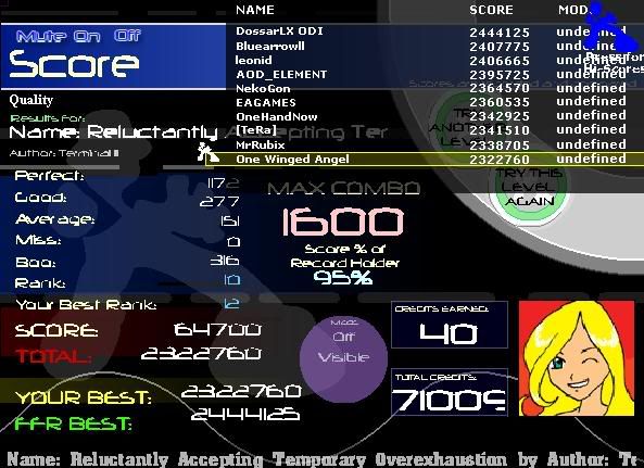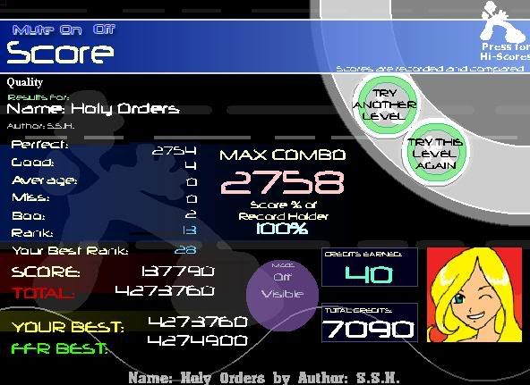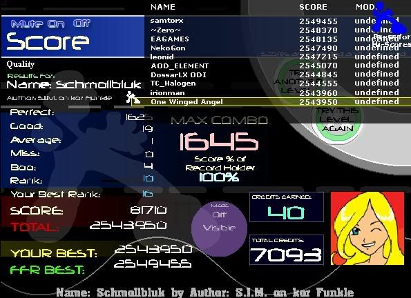 Keep at it, you'll AAA eventually. ![]() Anyway, my score: ![]() Yeah, I know I suck at this song, and I can't figure out why... |