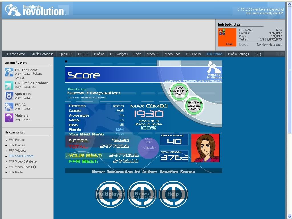 jnbidevniuhyb scores: Nomina Nuda Tenemus 1-0-0-0, Anti-Ares 1-0-0-0 Best AAA: Frictional Nevada (Done while FFR was out, so it doesn't show in my level stats) Resting. I might restart playing FFR seriously someday. |