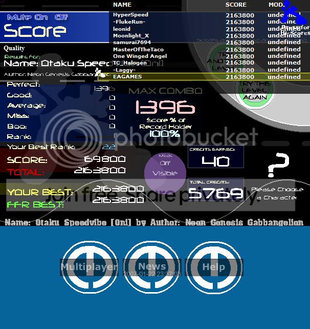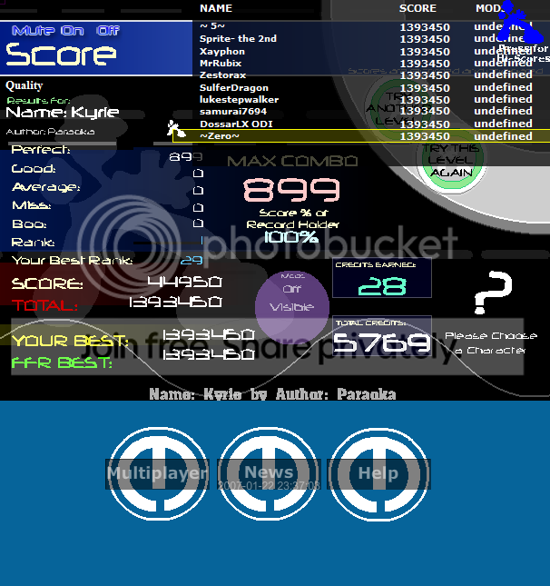 ![]() [My Profile] | [My Music] | [Play FFR] | [My Photobucket] | [My DeviantArt] AAAs: 210 (186+7+17) Best AAAs: Vertex BETA, Fighting for Control, Nova Pulser Recent AAAs: {Firestorm}, Dazzling Destiny, Hellbeat v2p 2nd place in 3rd Official Tournament 1st place in Jugglin/Jteh's 1st Tournament |