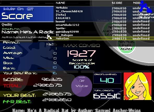 1st in Kommisar's 2009 SM Tournament 1st in I Love You`s 2009 New Year`s Tournament 3rd in EnR's Mashfest '08 tournament 5th in Phynx's Unofficial FFR Tournament 9th in D3 of the 2008-2009 4th Official FFR Tournament 10th in D5 of the 2010 5th Official FFR Tournament 10th in D6 of the 2011-2012 6th Official FFR Tournament FMO AAA Count: 71 FGO AAA Count: 10 Bluearrowll = The Canadian player who can not detect awkward patterns. If it's awkward for most people, it's normal for Terry. If the file is difficult but super straight forward, he has issues. If he's AAAing a FGO but then heard that his favorite Hockey team was losing by a point, Hockey > FFR PS: Cool AAA's Terry - I Love You An Alarm Clock's Haiku beep beep beep beep beep beep beep beep beep beep beep beep beep beep beep beep beep - ieatyourlvllol |