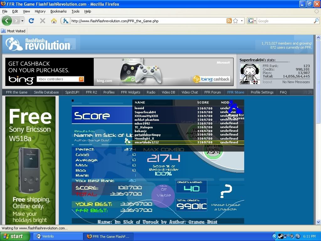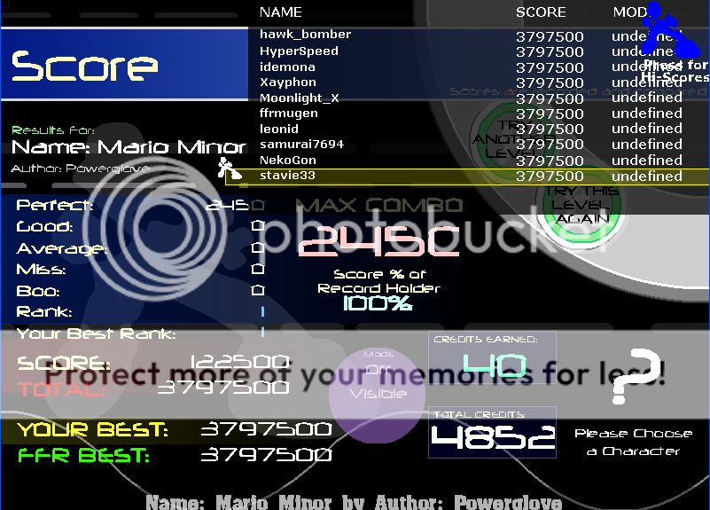 Removed a .gif image so your total signature size isn't well over 1MB. Keep this in mind for the future. 5th Official FFR Tournament Scores (Division 5) Round 1: Novo Mundo (AAA) Round 2: 4 Chord Touhou (AAA) Round 3: October (1.0.0.1) Round 4: Silly Symphony (1.0.0.0) Round 5: Hardkore Atomic (4.0.0.1) Round 6: Blue Rose (2.0.0.0) Round 7: La Dump (Eliminated for being lazy.) ![]() Quote: