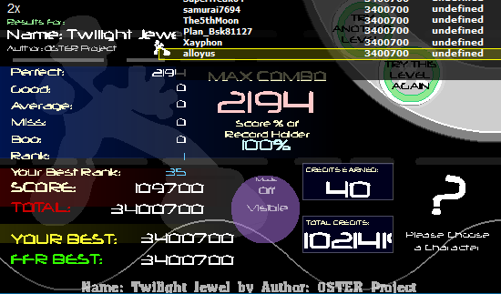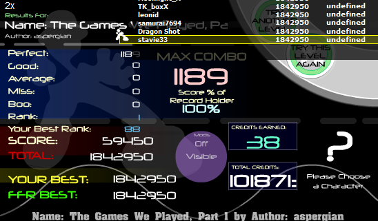 ![]() ![]() replay: http://www.flashflashrevolution.com/...play/58763088/ ps leonid I don't think you did it legit. Because you are you, you have to do it 100 times ![]() Last edited by awein999; 11-15-2010 at 03:45 AM.. |