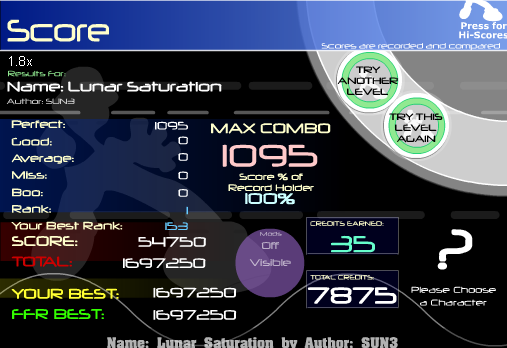 EDIT: Oh yea another thing that was wrong was at the results screen I could get more boos. D= The result wouldn't change (like, the number of perf/goods/av/mis/boo stayed) but my score would go down if i held down a key. Last edited by remedy1502; 12-12-2010 at 06:02 AM.. |