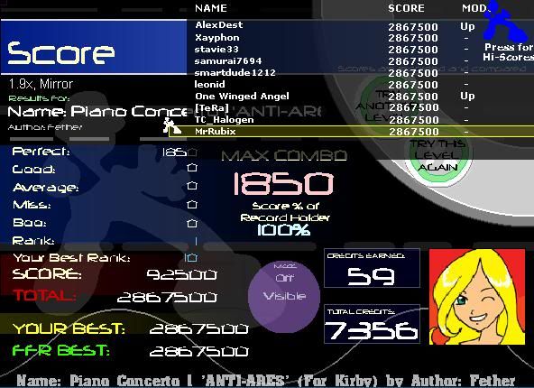 Anyway I played vrofl. And Crowdpleaser. FC'd CP like nothing, passed vrofl. ![]() Can an admin delete my scores on CP and vrofl? That would be excellent. I just better not get blacklisted or something. Cause then I'll be very very sad ![]() Video of 1207-16-13-0-1210 on Crowdpleaser. http://www.youtube.com/watch?v=-BW0f1WGAIg I tried to show the glitch. I'll do all the usual stuff (clear cache and such), see if it's fixed. If not, I'll post in bug forum. D= |