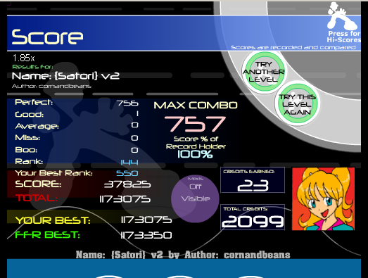 Nice azn score! =P Bowser did 7 life to you. Go beat him. =P My best score on that is mirrored as well. I asked myself why when it happened. XD That'll be your first VC AAA! GO GET IT! Gosh! I suck at this song! Good job! =D Criticism over. =P |