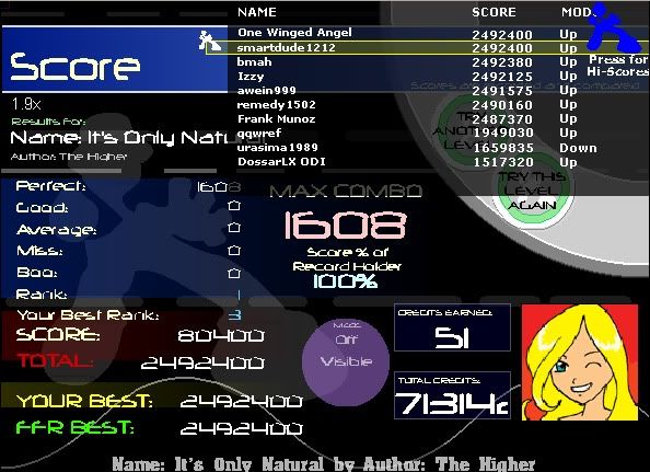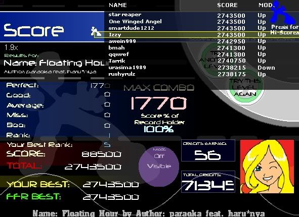21-1-0-1 on Floating Hour, jacks+hands = stepmania = I suck at it. Can't remember my It's Only Natural but it can be improved I know that for sure. |