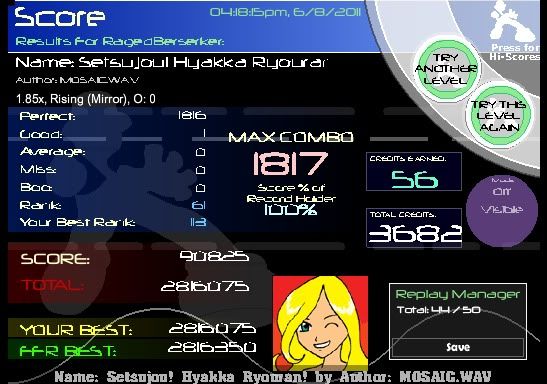 you could've played a few more games with the time you had (posting, typing up your post, etc) but yeah good scores, just not enough to be really noticed on the ffr scores thread nowadays the only scores you see here are like, AAAs and shit ![]() |