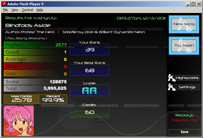 ![]() I then proceeded to improve to 3 clean, but my mouse was hovering over the Try Again button and as I tried to move it to save the replay, it restarted the song. I got 2 of the 3 goods in the first 400 notes, and the last one in a small little 1234[12] burst. I'll come back and AAA this some other time. EDIT: oh yeah, almost forgot - I whored Molto Vivace in hopes of getting the AAA. I have to play the song on mirror so I have to contend with left handed jacks at the end -- every single time I made it to the jack, I got two goods on the last two steps, and then nailed all of the mini-jacks with the roll/staircase stuff. I think I can nail this at some point too. Stopped at 177 restarts (I let some of them record to at least build my total score for this effort, lol). Last edited by TC_Halogen; 12-3-2011 at 07:52 PM.. |
