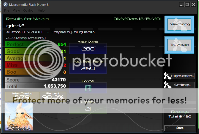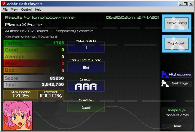 I played Kick Your A... And Missed somewhere stupid. I played the first 60 or so notes of Pianocore... I missed and threw my keyboard. At my screen. I wonder if anyone in FFRPartyy actually saw me do it cause I had the camera pointed at me when I did it. |
