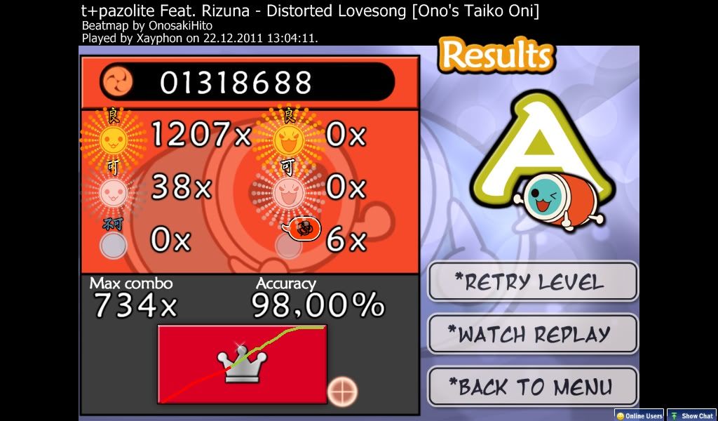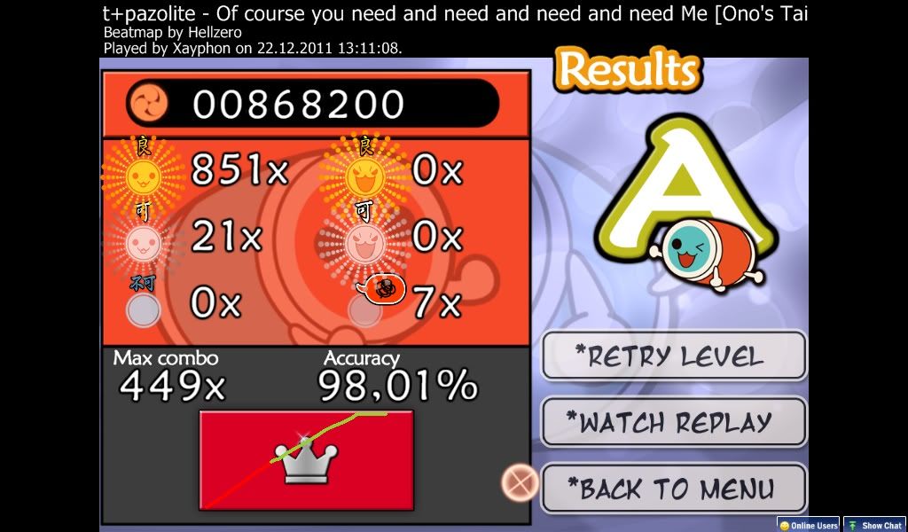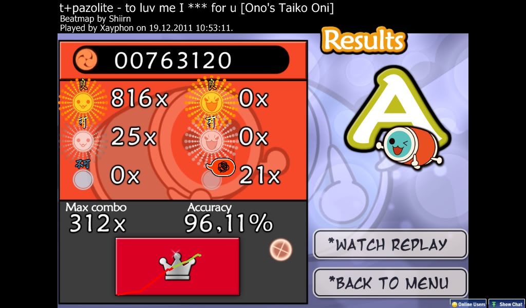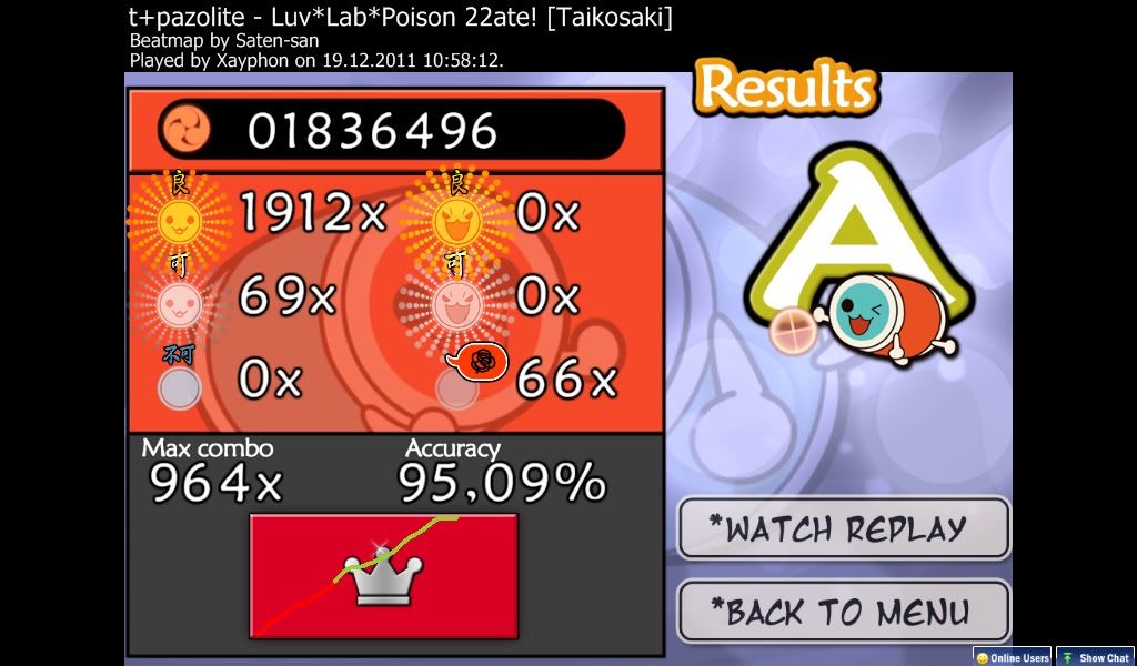 Oh well, got a nice clean FC on this too though. ![]() Taiko-time. Bleh, only rank 7 =S Still only managed to get rank 14, but got under 50 at the least. I'll try again tomorrow and see how I do.OH GOD RANK #1 MOFOS!!! Check the replay. Last edited by ScarletSky; 12-21-2011 at 02:49 AM.. |