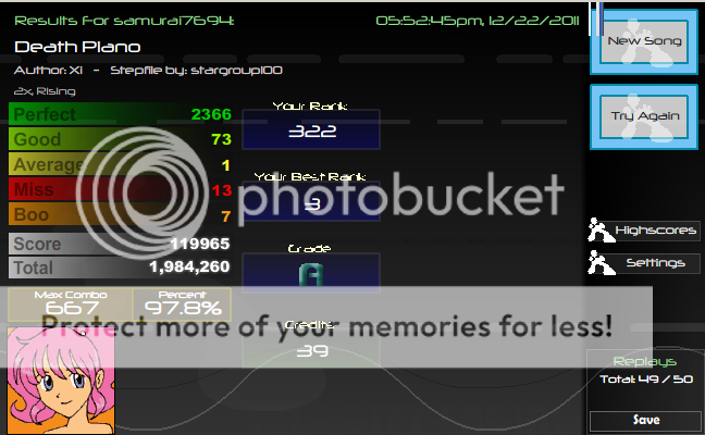 What pissed me off most is how arbitrary of a file DP is in the first place but it kept popping up in my head whenever I saw other scores posted, so you won't be seeing useless "****** mash DP" comments from me now Yes I was a dumbass for posting all that, deal w/ it. I've gotten over the DP issue now Anyways, crosspost from tournament thread, third time AAA'ing this file to record on the dashboard ![]() |