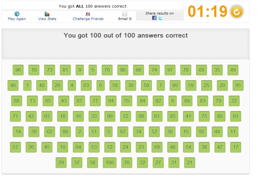 could be better, of course. was just trying to "prove" they probably aren't cheating. i mean there's always this option: i'm not the fastest at this, but here's what i did: -make sure the first 10 are hit before 3:45 , the first 30 are hit before 3:00, and 60 are hit before 2:00, otherwise restart. keep this pace, and consider the last 40 *should* go by quicker -if i get stuck for more than 4 seconds at *any* point, restart -eyes defocus so the greens are completely ignored, becomes much easier after 30 hit -memorize the 10s digit of each bottom row number for quick reference (the smaller row) -scan the screen as much "up and down" as possible, instead of left to right -hope for an easy arrangement/distribution of numbers Last edited by Emanresu13; 05-27-2013 at 10:46 AM.. |