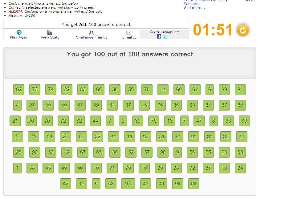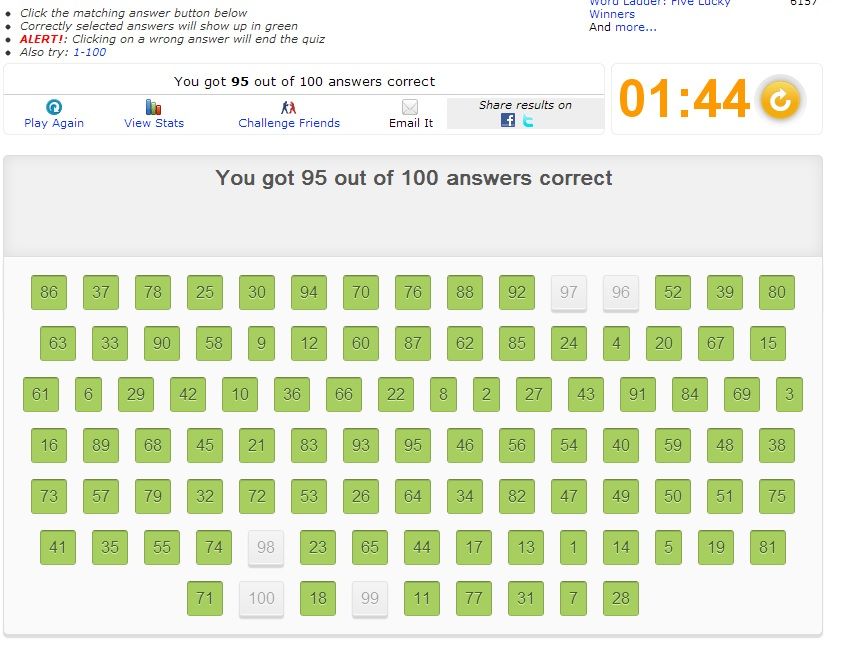 If I am working on the 30s, I will scan every number, but make a mental note of which ones start with a 3 and what their last digit happens to be. If I'm looking for 31 but I notice 37, I know I'll have to come back to that area of the screen, but if I haven't seen any of 31-36 yet, I know I won't need to go to that area for a while. It eliminates the need to search there again and again for each new number. Edit: Clicked 96 but it didn't register so I lost at 97... otherwise a fantastic run and the number placement was fairly ideal (look at 47-51 all near each other). ![]() Edit2: Hit 83 after 2 minutes... this is about as good as it gets from me. ![]() Ball's in your court. Last edited by smartdude1212; 05-27-2013 at 04:18 PM.. |
