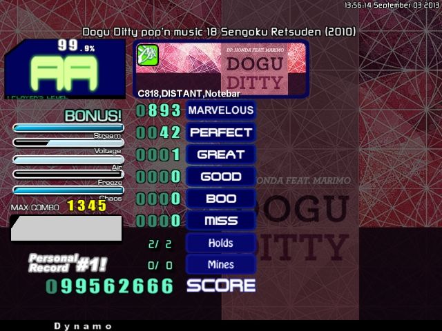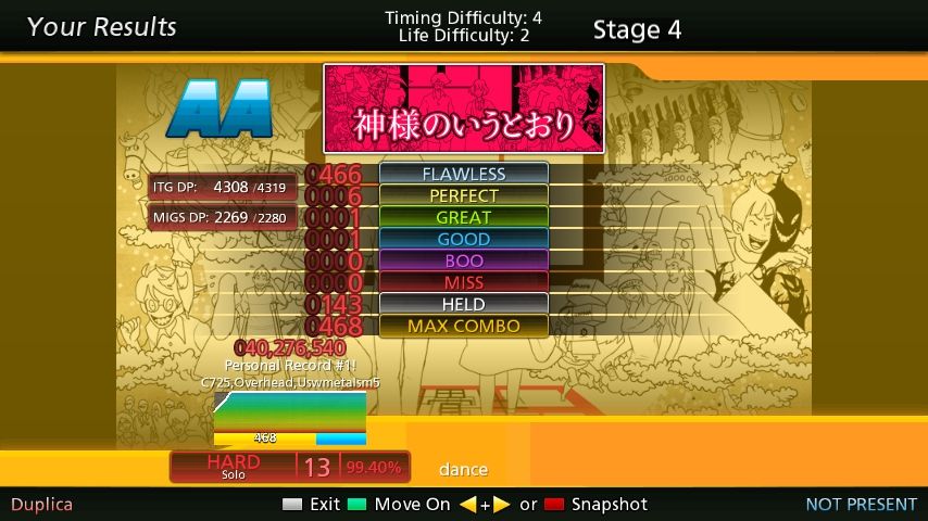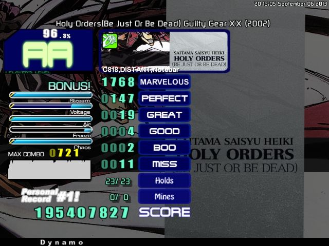 At this point, I don't even think posting my crappy scores would be worth anything...o.o Damn, I gotta work harder at this solo thing. Need moar tiem!!!! D= (posting anyway) ![]() I really like this file. A lot. Like seriously. Will try to aim for sdg in the next month or so. ![]() The joy of random lag spikes. AAA'able. Possibly low teens p if I don't suck. lol ![]() Def one of my fav files in the pack. Very fun with an awesome chart. ![]() Sightread, didn't bother for second run yet, though will aim for fc soon. Also, I don't know who approved of the Holy Orders chart, but I think it's garbage. It's really...weird, and not in a good way, following funky patterns that I didn't even hear at certain parts. It was too all over the place, though the solos were awesomely done. <3 Also, I didn't know you could make a hard chart ca25nada. ;P Your Oni chart...thoroughly scared me with them patterns. >.< ![]() Not a good score. Sightread so I think it's at least semi-decent. =) Excellent chart, though. The difficulty was just perfect imo for my current level. Now go to cry in a corner. orz |