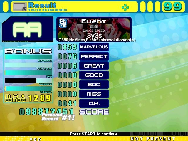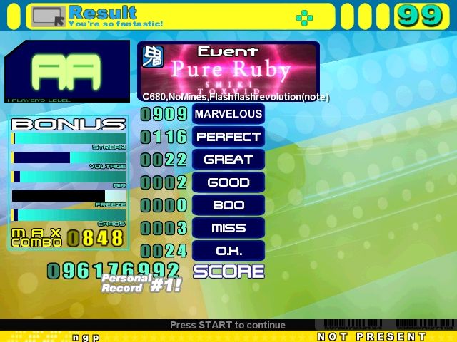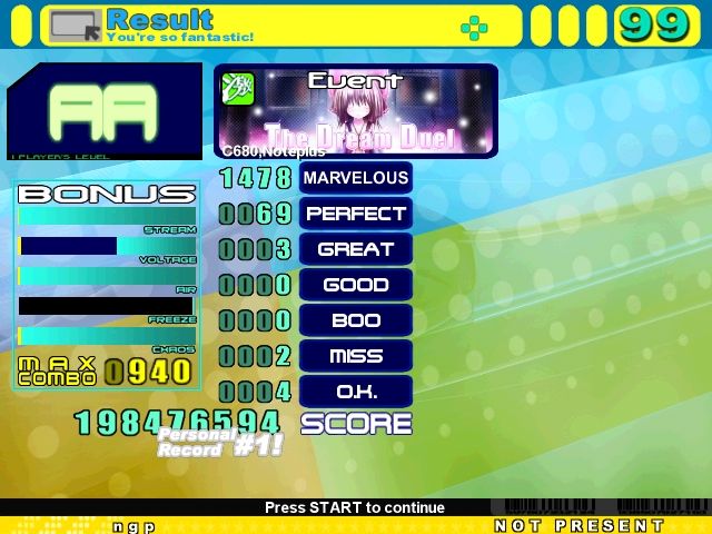 I haven't been able to do speed stuff lately and it's been pissing me off. bleh. Only speed score I was able to get. Sub 90's cool I guess. MA's pretty good. PA not so much. Choked at the end. I really want to drop the MA count by a lot. Haven't played this file in a while. I lose my focus a lot for long files where the arrows start to look blurry or something like that. Oh, and I saw OldCartoon post this about ten minutes ago.