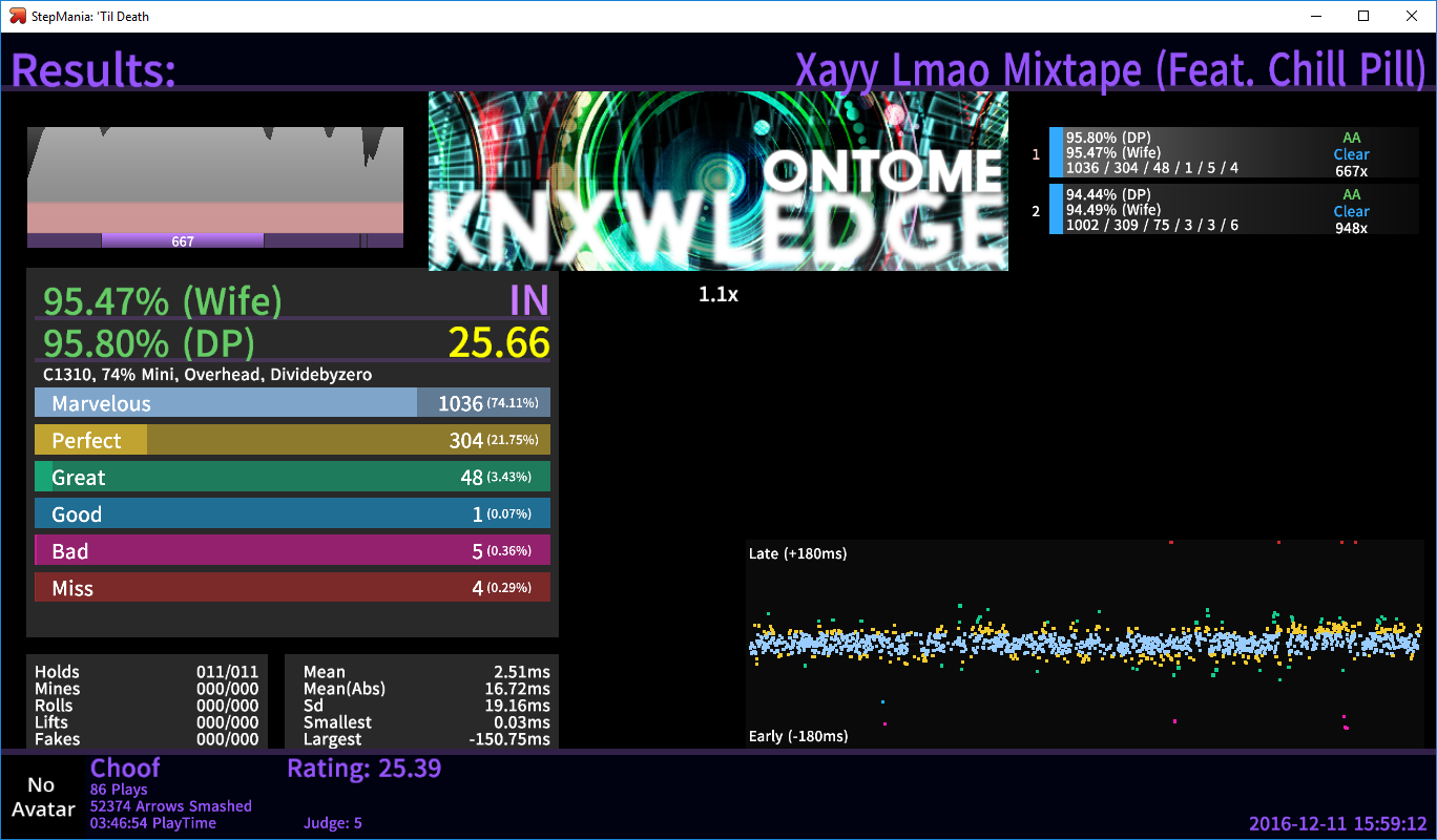 first off, the j5 scores super clean ![]() 1.1, was still warming up so I think I can crush this ![]() 1.3, awful PA ![]() 1.2, the quadjack wrecked my score but I pulled it back together for the AA ![]() 1.1, I think I could FC this ![]() 1.2, I don't think I've actually played through this entirely, or at least I haven't played it in literally years. super fun though ![]() hi lol ![]() after snadstrom I played a bit of jack stuff 1.3, tried 1.4 after this one but that's rough ![]() 1.2, probably no one plays this chart but it's really fun on rates. 1.3 is brutal ![]() honest to god sightread, this chart is fucking awful but I'll probably play it again because I could probably destroy it ![]() after this I started streaming, derped around to get offset correct since I had to play windowed. dropped down to j4 to compensate... and proceeded to destroy my arms while getting this score ![]() probably shit scores overall but hey I'm playing 4k again so someone be my rival pls Last edited by choof; 11-20-2016 at 09:43 PM.. |