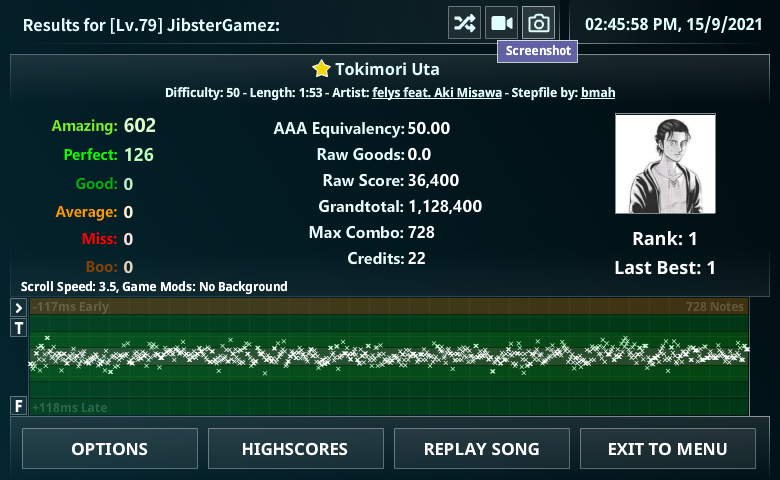 Main Submission: ![]() Getting AAA's on command is too hard for me so have a blackflag! Bonus 1: ![]() Link to YouTube video: https://youtu.be/dU37VGsxDv4 Tokimori Uta is a special song to me, just like FFR is special to me. I started playing FFR in what were very dark times in my life, and it's one of the main things that always gave me joy, this song however is very special. I have played Tokimori Uta from way below my skill rating all the way to still playing it now, and remembering it well, the song is very calming and exactly my style, and I love the harmonies and piano in it. And on top of that the file is amazing to play, my favorite file on FFR. Bonus 2: ![]() Replay: https://www.flashflashrevolution.com...replay/434372/ Yeah... I don't have much to say about this bonus except that I am no way going to try and get the lowest score of my division on this! Last edited by JibsterGamez; 09-15-2021 at 08:59 AM.. Reason: I had some trouble embedding the images. |